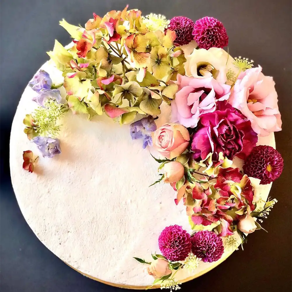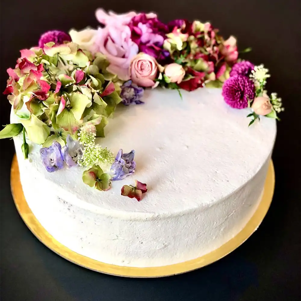 Ein kleiner Blütentraum ziert diese sonst sehr dezente und schlichte Torte. Sie besticht durch ihre florale Gestaltung aus echten Blüten und bettet sich super in eine feierlich gedeckte Tafel ein. Eine Aufschrift kann nach Wunsch ergänzt werden.