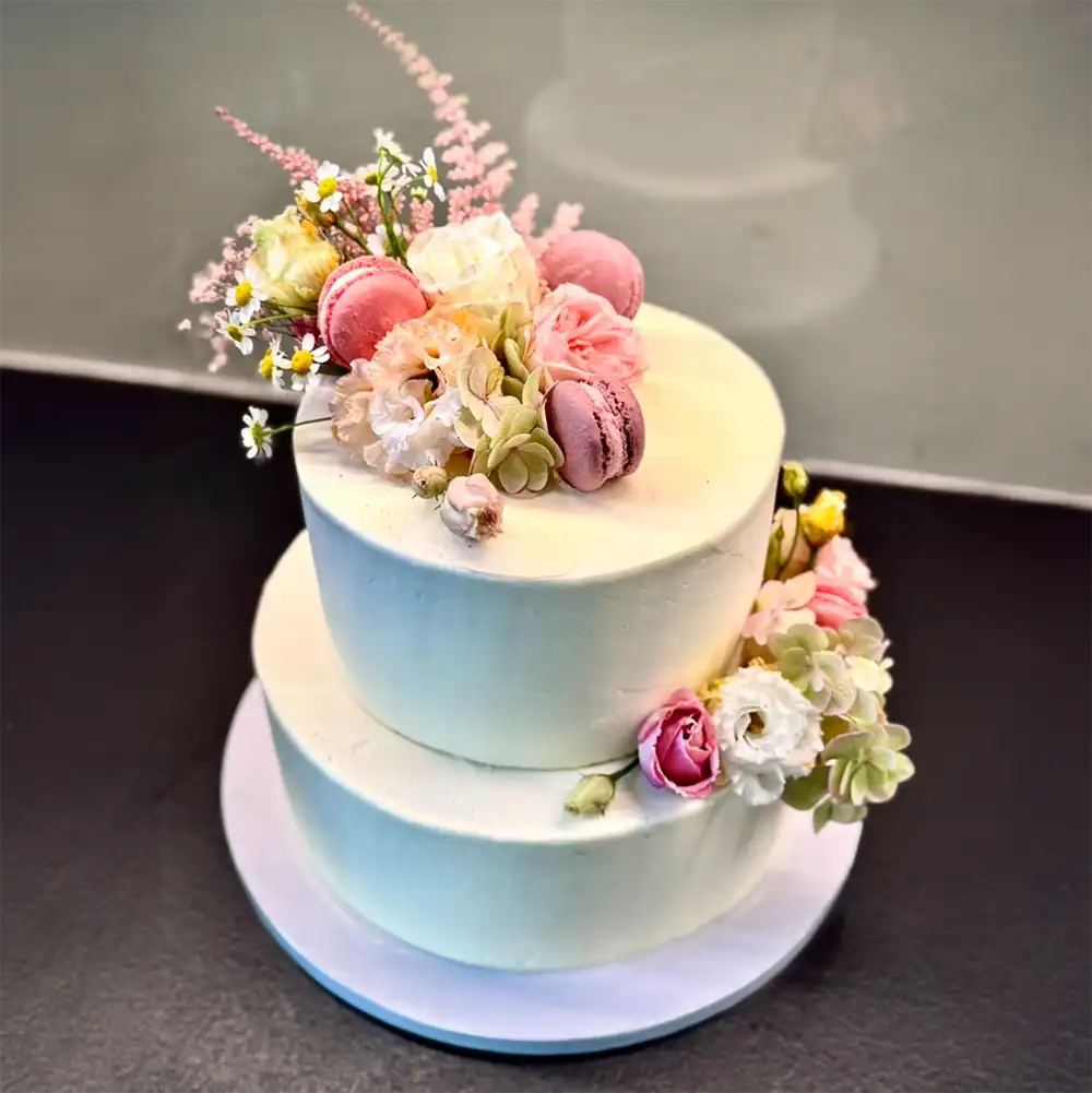 Diese zweistöckige Schönheit eignet sich für verschiedene Feiergelegenheiten ideal: Ob Hochzeit, Taufe oder auch Geburtstagsfeier, die Torte besticht durch ihre schlichte und verspielte Eleganz aus einem Blumenbouquet und feinen Macarons, als kleine hübsche Hingucker. Frische Zutaten können unterschiedlichste Geschmäcker für euch vereinen. Wählt euch hierfür gern eure Lieblingssorte unten aus oder ergänzt weitere gewünschte Details.